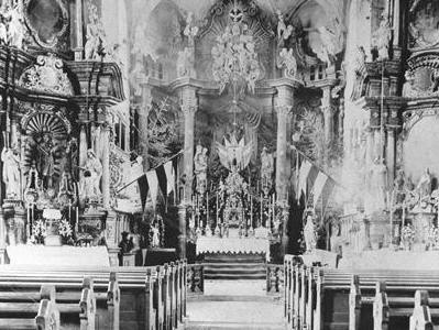 Inzwischen war der Erste Weltkrieg (1914-1918) ausgebrochen. Es war eine Zeit voller Angst, Not und Leid; auch Jahre nach Kriegsende hielt die Not an. 1916 verstarb Pfarrer Schmitt im 79. Lebensjahr. Sein Nachfolger Michael Dötzer (1916-1922) war ein eifriger Seelsorger, doch für die Verschönerung der fehlten ihm die Mittel. Dötzer litt übrigens an Magenkrebs und starb im Alter von nur 51 Jahren. Sein Nachfolger Johann Hart (1922-1936) ging mit großem Eifer ans Werk. Am 2. Weihnachtsfeiertag 1922 hielt er eine Predigt mit dem Thema „Ausgestaltung der Kirche“, die begeistert aufgenommen wurde. Daraufhin veranstaltete man eine Haussammlung, die neben reichen Sachspenden 5 Millionen Mark erbrachte. (Das Deutsche Reich steckte zur Jahreswende 1922/23 Mitte in der „Inflation“, die eine stetig fortschreitende und sich beschleunigende Geldentwertung brachte. Im Herbst 1923 bezahlte man eine Billion Papiermark für eine „Rentenmark“, die neue Währung.) Die Spenden, so berichtet Hart, wurden mit einer rührenden Freudigkeit gegeben; kein Haus schloss sich aus. Laut Vertrag vom 14. Januar 1923 verpflichtet sich Architekt Bachmann, seine so lange unterbrochenen Arbeiten wieder aufzunehmen und bis spätestens 1. Juli 1923 zu vollenden: den Herz-Jesu-Altar mit Herz-Jesu-Statue (rechts), den Marienaltar mit Pietà (links), die Kanzel, vier Beichtstühle, zwei Chorstühle, drein Innentüren mit Windfängen, zwei Glasgemälde hinter dem Hochaltar, ein großes Missionskreuz gegenüber der Kanzel; dazu kamen noch Stuckverzierungen und dergleichen, ferner ein Thronsessel. |