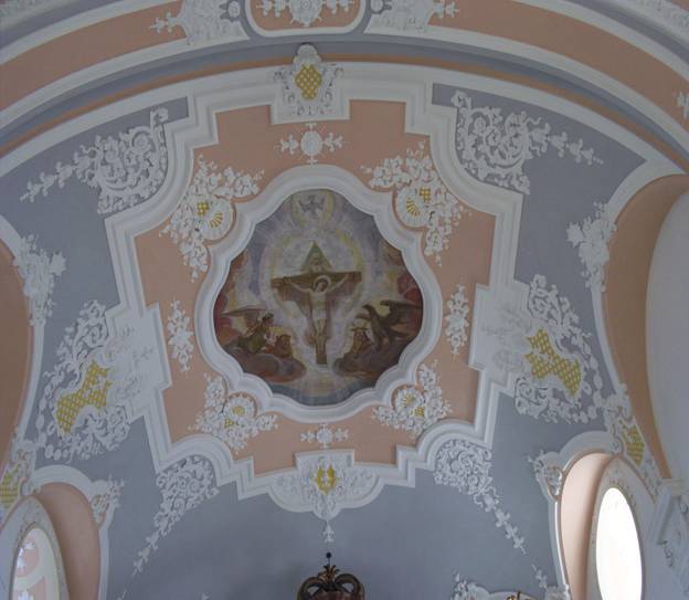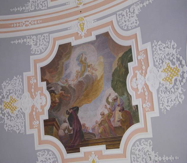 Das zentrale Deckengemälde zeigt die Aufnahme Mariens in den Himmel. Es wurde ebenfalls von Hans Bayerlein geschaffen.