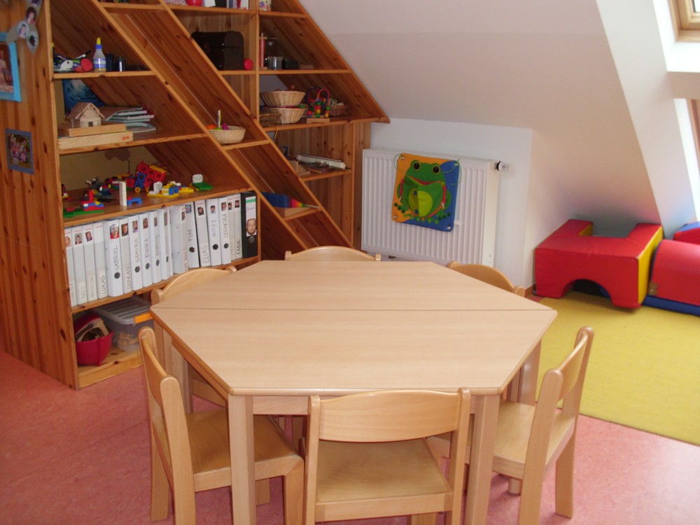Delphingruppe: Erzieherin: Regina Stumpf Kinderpflegerin: Marianne Rübesam Diese Gruppe ist nach unserem Umbau in den Dachboden gezogen und hat dort einen großzügigen Bereich erhalten (großer, heller Gruppenraum, Nebenraum, Waschraum und Garderobe).