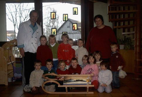Holzschlitten geschenkt. Außerdem überreichte er jedem Kindergartenkind ein Paar