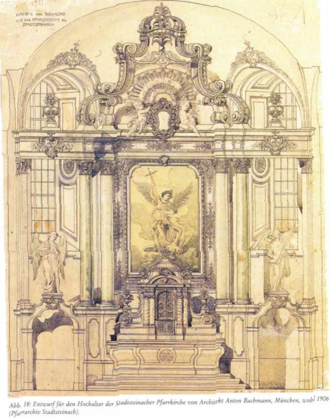 „Herzliche Bitte! Am 26. Februar 1903 wurde unsere schöne, frei und hoch gelegene katholische Pfarrkirche durch Übertragung der Funken von einer weit entfernt gelegenen in Flammen geratenen Mühle total zerstört Die Kirche war mit Rücksicht auf ihre isolierte Lage bloß mit 33970 Mark brandversichert. Der die Baulast tragenden Kirchenstiftung stehen nur inklusive der Brandentschädigung ca. 45000 Mark an Baukapital zu Gebote, während die Kosten des Rohbaues dem Voranschlage gemäß sich auf 162000 Mark belaufen; hierzu der Aufwand für die innere Einrichtung, als: Altäre, Glocken, Orgel usw. gerechnet, ergibt sich eine Bedarfsumme von mindestens 200000 Mark. Die hiesige ca. 2100 Einwohner zählende Pfarrgemeinde, die zur Befriedigung ihrer religiösen Bedürfnis auf eine ca. 200 Menschen fassende Kapelle angewiesen ist, besteh vorzugsweise aus Kleingütlern, Handwerkern und Tagarbeitern, für welche wegen der unvermeidliche drückenden Umlagen eine schwere Zeit anbricht. In unserer Not wenden wir uns an alle teilnahmsvollen Herzen mit der dringenden Bitte, ein Scherflein zu unserem Kirchenbau beizutragen. Gott wird es ihnen lohnen. Hiezu erlauben wir uns zu bemerken, dass Seine Königliche Hoheit Prinzregent Luitpold in Rücksicht auf die traurige Lage der Pfarrgemeinde unterm 13. Februar laufenden Jahrs die Erlassung eines öffentlichen Aufrufs in den Zeitungen des Königreiches Bayern allergnädigst zu bewilligen geruht haben. Stadtsteinach, den 6. April 1904 Die katholische Kirchenverwaltung Schmitt, Pfarrer Schübel, Bürgermeister Simon, Pfleger
