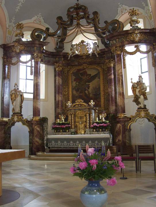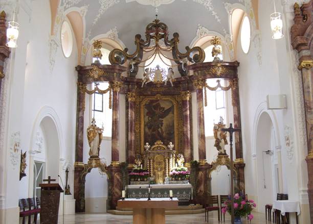 1912: Holzaufbau in Anlehnung an den Hochaltar der Wallfahrtskirche Marienweiher ausgeführt von der Firma Schoyerer aus Cham, das Altarblatt stammt von Max Colombo. Dieses Bild zeigt den Kampf zwischen Erzengel Michael (Kirchenpatron) und Luzifer.