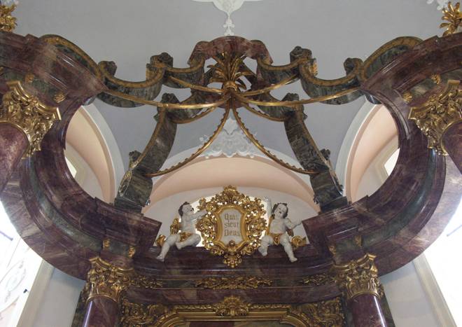 Zwei Engel halten die lateinische Schrift „Quis sicut Deus“ in der Hand. Übersetzt heißt dies etwa: „Wer ist so wie Gott?“. Diese Frage bezieht sich auf das Bild am Altar darunter, auf dem dargestellt ist, wie der Erzengel Michael den Luzifer aus dem Paradies jagt, weil dieser so sein wollte wie Gott. Der Tabernakel