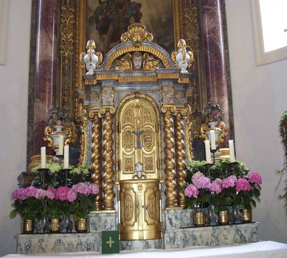 Der Tabarnakel im Hochaltar ist wie ein heiliger Tresor, in dem der Leib Christi aufbewahrt wird. Er ist in einem verzierten Schrein, der Monstranz sichtbar und wird z.B. bei Prozessionen mitgeführt und hergezeigt.
