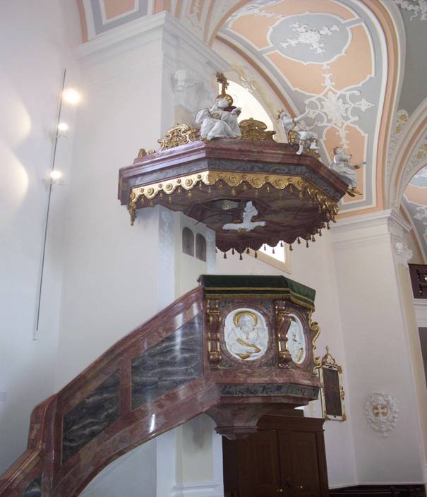 Die vier Figuren auf dem Dach zeigen die damals bekannten Erdteile (Europa, Asien, Afrika und Amerika). Das Wort Gottes soll in alle Welt verkündet werden.