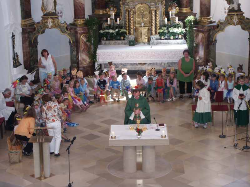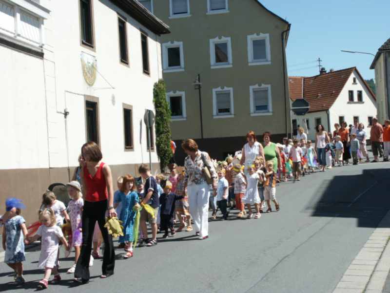 Bei strahlendem Sonnenschein zogen die Kinder mit ihren Erzieherinnen, viele Fahnenabordnungen der Vereine und die Gläubigen unter den Klängen der Jugendkapelle des Musikvereins – Leiter Manfred Korkisch - durch die Straßen der Stadt zum Festplatz vor dem Kindergarten. Dort hatten dann die Honoratioren der Stadt und alle Ehrengäste Gelegenheit ihre Grußworte an die Festgäste zu richten.
