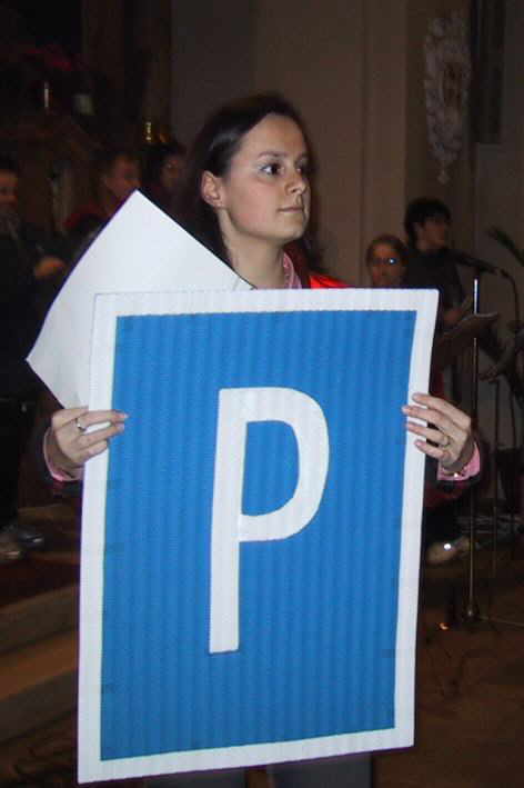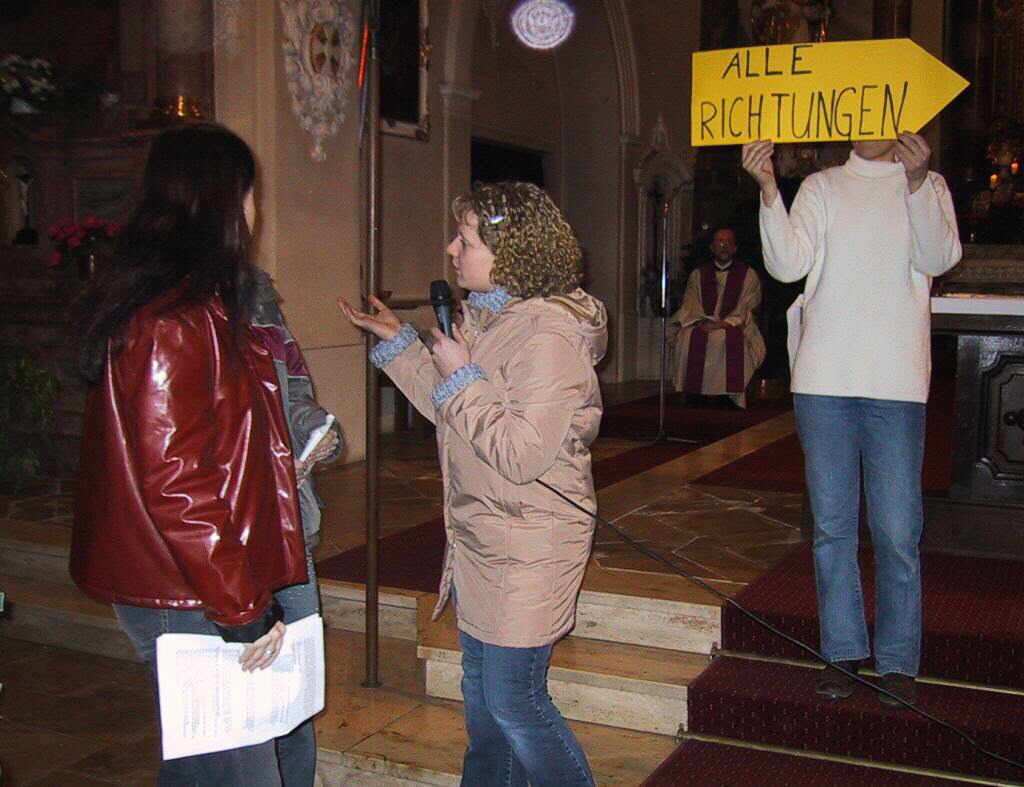 Als das richtige Schild gefunden war, begrüßte Dekan Roppelt die sehr zahlreich erschienene Gemeinde, viele wüssten nicht wohin im Leben, aber Gott sei dieses Durcheinander nicht gleichgültig. Die Darsteller betrachteten anschließend wohlwollend das „Schild des Herrn“ und freuten sich über die gelebte Liebe Gottes, die Nächstenliebe die, die Menschen durch Jesus erfahren und die Erkenntnis, dass eine Umkehr möglich ist und Jesus verzeiht. In den Fürbitten wurde für die gebetet, die Zeichen nicht oder falsch wahrnehmen oder für die Verantwortlichen, den rechten Weg zu weisen.