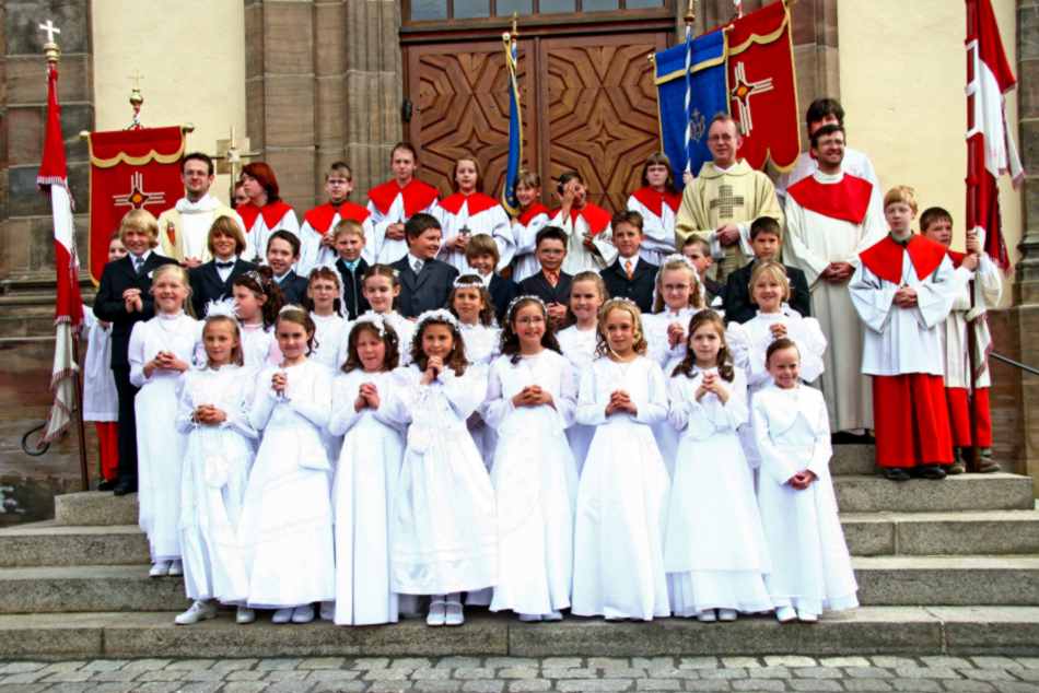 "Die Tür zu einem Leben in Fülle"16 Mädchen und zehn Buben traten in der Stadtpfarrkirche erstmals vor den Tisch des Herrn. Der Musikverein Stadtsteinach, sowie die beiden Geistlichen Dekan Hans Roppelt und Kaplan Daniel Schuster holten die jungen Christen auf dem Marktplatz ab und geleiteten sie zum Gotteshaus. Pastoralreferent Klaus Oberkofler stellte seine Predigt unter das Motto „Jesus ist die Tür zu einem Leben in Fülle“. Jesus heißt uns willkommen, seine Tür ist immer offen in allen Situationen. Bei freudigen wie bei traurigen Ereignissen können die Menschen zu ihm kommen, sagte Oberkofler. Kaplan Daniel Schuster spielte die Orgel, die Jugendband unter Leitung von Silke Weiser-Oberkofler und der Elternchor gestalteten den feierlichen Gottesdienst mit aus.