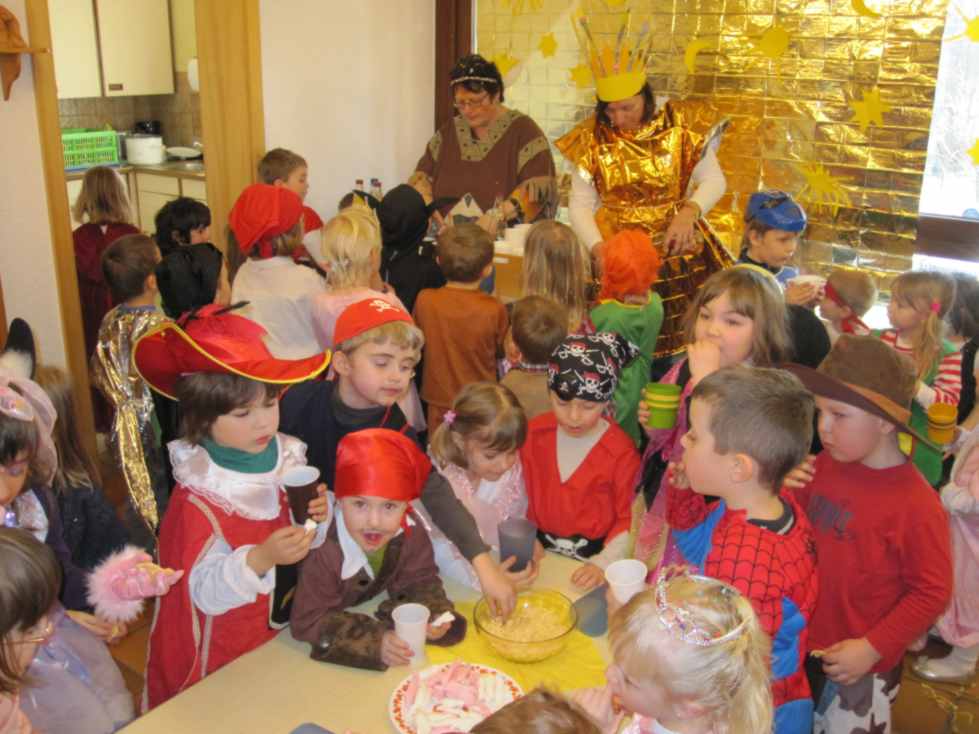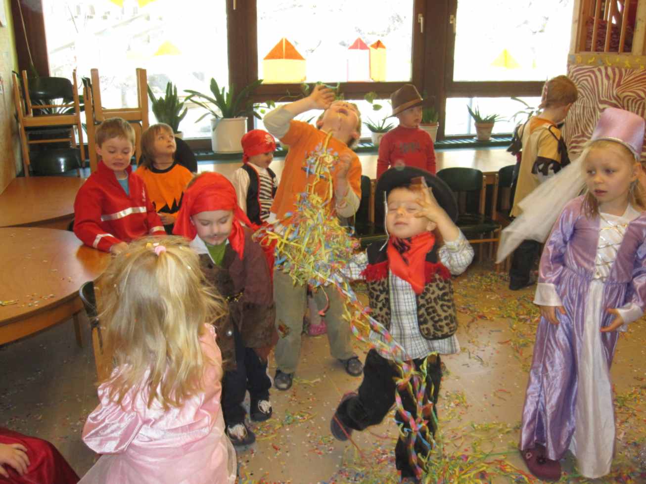 Los ging es mit Musik, Konfetti- und Luftschlangenschlacht in den Gruppen. Nach einer Stärkung mit Wienern ging es dann auf zu den einzelnen Wettspielen, die in den Gruppen stattfanden. |
